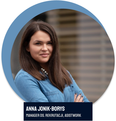 Jestem Ania! Na co dzień rekrutuję i zarządzam zespołem w Asistwork. Moje dziedziny to administracja, zarządzanie zasobami ludzkimi i pozyskiwanie talentów, także tych jeszcze nieoszlifowanych.